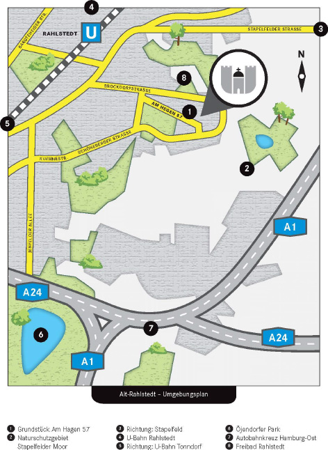 Der Stadtteil ist an den HVV mit vielen Buslinien und der Regionalbahn R10 Hamburg-Lübeck angeschlossen. Die Regionalzüge halten direkt am Rahlstedter Bahnhof und sind in kurzer Zeit in der Hamburger Innenstadt. Das Grundstück liegt in einer gewachsenen ruhigen Wohnstraße im Hamburger Stadtteil Alt-Rahlstedt und gehört zum Bezirk Wandsbek. Alt-Rahlstedt befindet sich im Osten der Hansestadt und verfügt über gepflege Ein- und Mehrfamilienbebauung.